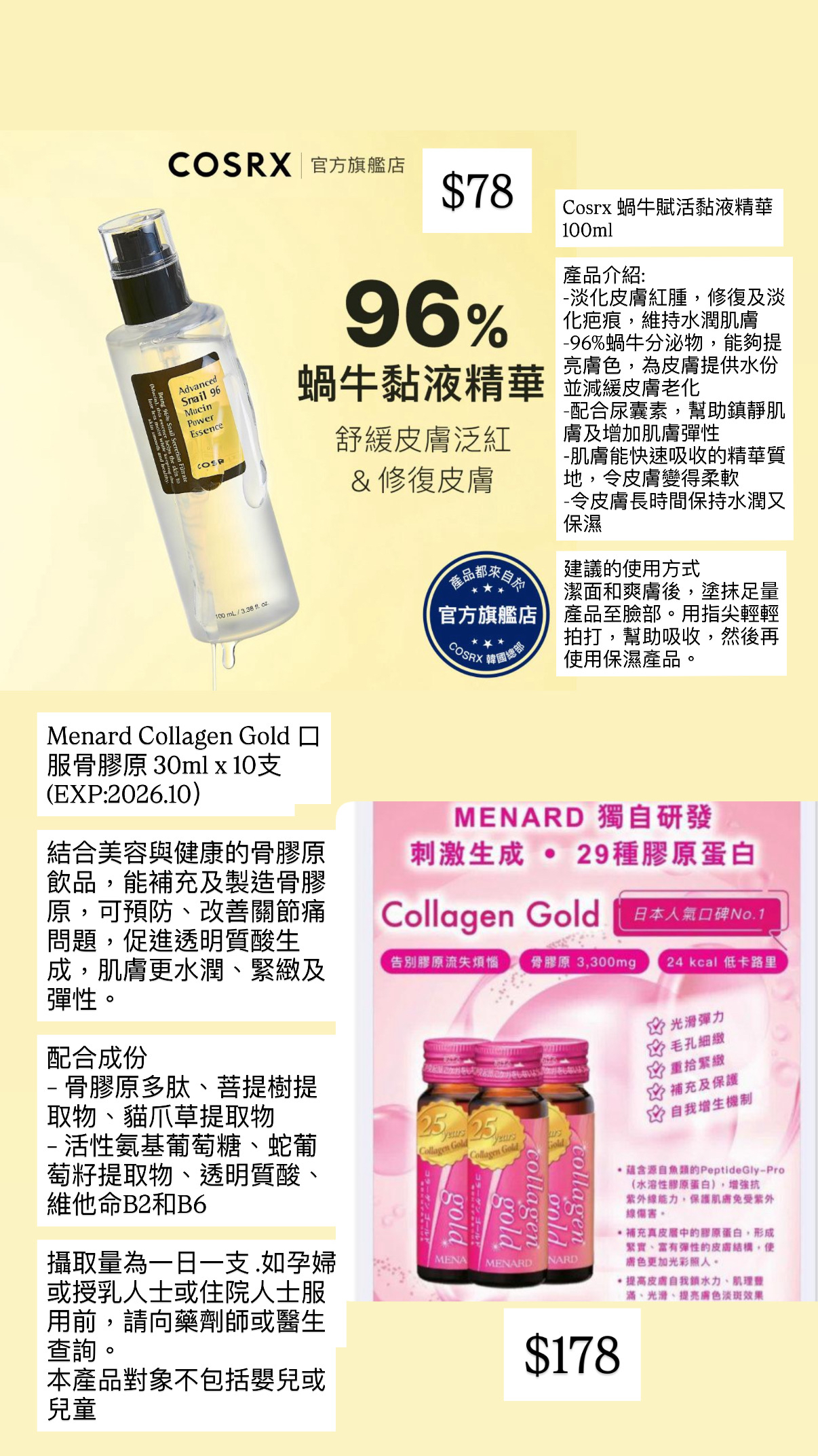 (美容展價)Cosrx 蝸牛賦活黏液精華 100ml / Menard Collagen Gold 口服骨膠原 30ml x 10支