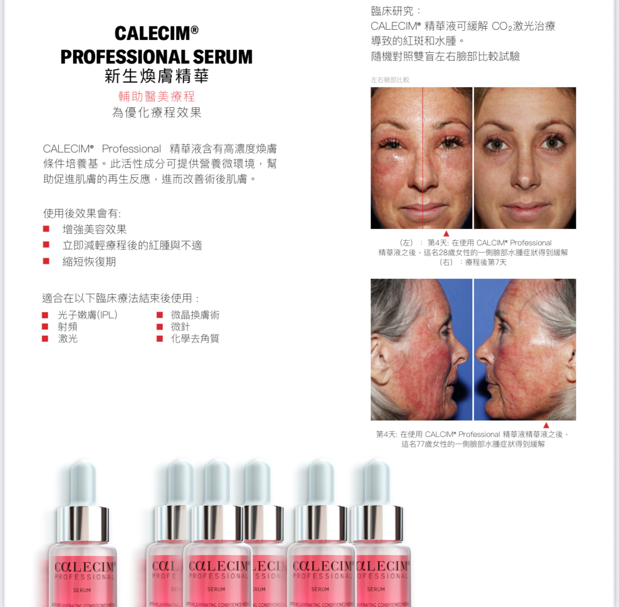 Calecim 新生煥膚精華 5ML x 6枝 -含有最高濃度的 PTT-6® -保持肌膚柔軟健康, 同時針對細紋、皺紋和色素沉著過度 -可每日與其他護膚品一起使用以優化效果 -推薦用於臨床或家庭皮膚治療, 以促進皮膚修復和更新 💥3 種使用方法💥 1.作為日常抗衰老護膚 在塗抹其他乳霜和護膚品前,將其塗抹到整個臉部 2.微針/化學換膚/磨皮療程後在家使用 新生煥膚精華將您的家用護膚步驟昇華 3.配合醫美療程使用 診所廣泛使用,以縮短康復時間、手術後不適和腫脹,並優化醫美效果