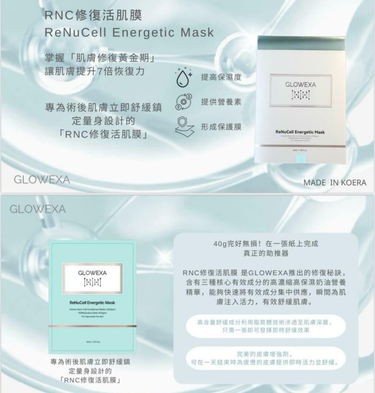 GLOWEXA RNC修復活肌面膜7片 醫美療程前/中/後都會有一個「肌膚修復黃金週」: *前* 預保養:在醫美療程前,包括:RF、HIFU 、微針、射頻微針、皮秒及光學等療程前連續使用7日,可以鞏固肌底提高耐受度。 *中* 期保養:醫美療程痛楚及感覺通常會維持一至兩日,肌膚表層產生熱能或微破壞,此時保養著重於快速降溫並緩解泛紅,減少肌膚負擔。 *後* 期保養:術後七日為肌膚功能重建黃金修護期,減低容易導致二次發炎引起的色素沉澱變黑,保養產品成份需以舒緩及修護雙效並重。 *特別護理* 每月經期後連續7日可以修復提高皮膚再生能力,增強保濕力及穩定皮膚炎症 *掌握「肌膚修復黃金期」* *讓肌膚7倍恢復好狀態!* 針對「肌膚修復黃金週」而設,透過獨有配比成分的三階保護系統,喚醒皮膚的免疫力和修復能力 ~提高保濕度:足夠的水分使細胞生長因子和營養能順利運送到需要的部位。 ~提供營養素:提供形成血球和膠原蛋白等新生組織所需的原料。 ~形成保護膜:保護新長出的肌膚,免受外界環境的傷害。 *肌膚修復週期的協同黃金鐵三角成份* -ReNuCell 9,700ppm + PDRN + EGF 含有三種核心有效成分的高濃縮高保濕奶油營養精華,能夠快速將有效成分集中供應,瞬間為肌膚注入活力。